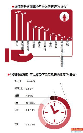 居家消费中,免费配送、以旧换新、省心装等服务已与产品深度绑定,不少消费者更愿意为各类增值服务买单。南都数据显示,此次受访者需求度最高的增值服务为家具/大件免费送货,比例高达42.77%,位居第一。综合各电商在分期免息、数码电器延保、以旧换新、家具/大件免费送货、生鲜配送、家装建材配送、在线问诊、药品配送等10方面的增值服务后,得分显示,京东在各平台中得分最高排名第一,其次是天猫/淘宝和苏宁易购。