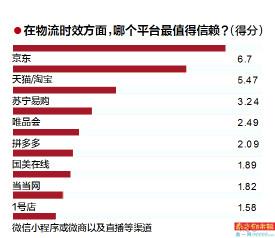 从各电商配送时效来看,南都《报告》数据显示,最受信赖的电商平台是京东,得分最高排名第一,其次则是天猫和苏宁易购。不仅如此,在物流配送时效排名第一位的占比中,京东物流以38.5%领先其他平台。这也就意味着,近四分之一受访者选择了京东物流,较为认可京东配送服务。