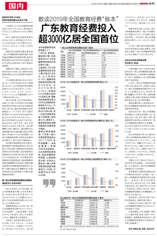 去年全国教育经费都花哪儿了?11月3日,教育部、国家统计局、财政部发布2019年全国教育经费执行情况统计公告。公告显示,2019年全国教育经费总投入首次超过5万亿元,比上年增长8.74%。国家财政性教