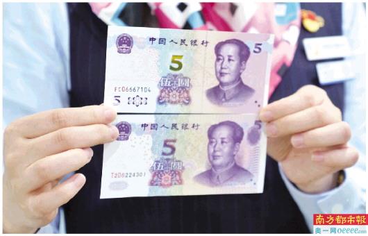 银行工作人员展示新旧版本的五元纸币(上面为新版,下面为旧版)。中国人民银行于2020年11月5日起发行2020年版第五套人民币5元纸币。新版5元纸币正面中部面额数字调整为光彩光变面额数字“5”,左下角和右上角局部图案调整为凹印对印面额数字与凹印对印图案。左侧增加装饰纹样,调整面额数字白水印的位置,调整左侧花卉水印、左侧横号码、中部装饰团花、右侧毛泽东头像的样式。取消中部全息磁性开窗安全线和右侧凹印手感线。新版5元纸币背面左上角和右下角局部图案调整为凹印对印面额数字与凹印对印图案,调整主景、面额数字的样式,票面年号改为“2020年”。 石磊 庄欢 摄