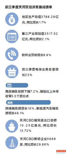 前三季度,天河GDP总量继续稳居全市首位,占全市比重提高至21.7%,同比提高1.7个百分点,经济发展延续复苏势头,增速分别比国家、省、市高1、1、0.7个百分点,主要经济指标呈稳定增长态势。