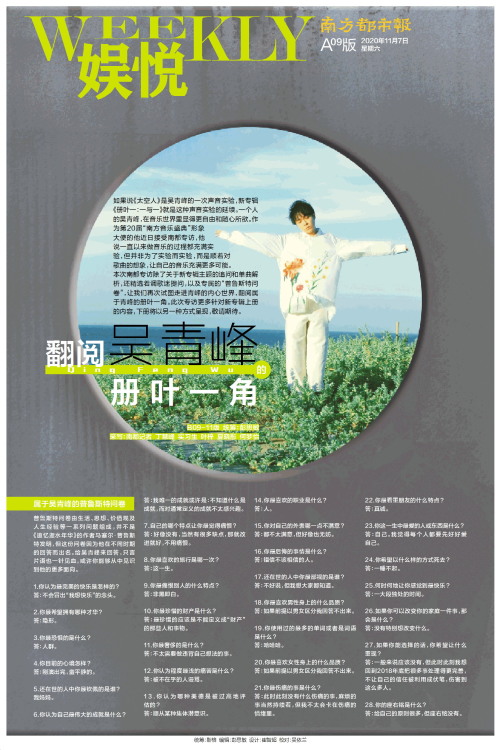 如果说《太空人》是吴青峰的一次声音实验,新专辑《册叶一:一与一》就是这种声音实验的延续。一个人的吴青峰,在音乐世界里显得更自由和随心所欲。作为第20届“南方音乐盛典”形象大使的他近日接受南都专访,他说
