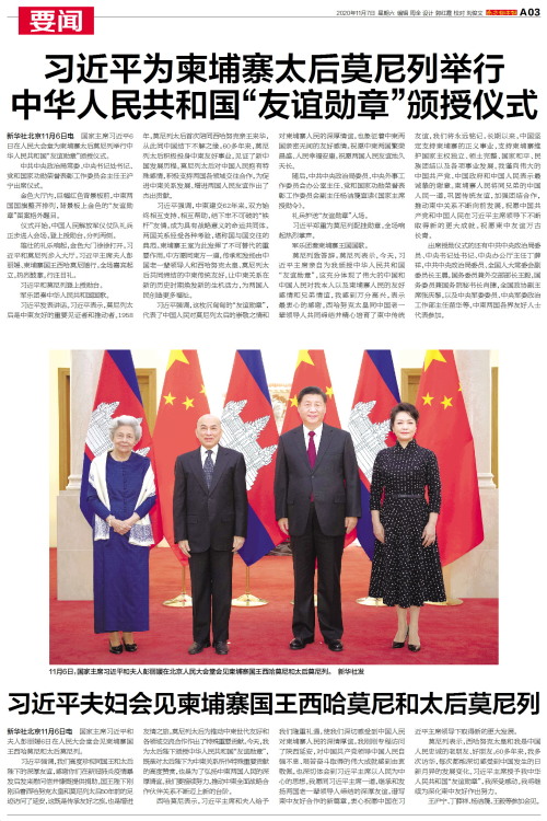 习近平为柬埔寨太后莫尼列举行中华人民共和国“友谊勋章”颁授仪式