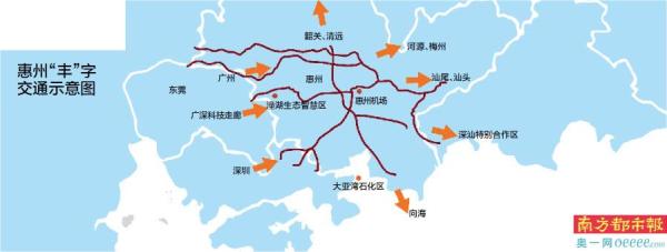在“惠州‘丰’字交通主框架带动发展示意图”上,南都记者还看到,根据规划,主框架建成后,将被划分为惠城中心组团、仲恺组团,以及大亚湾惠阳组团等各个不同板块。