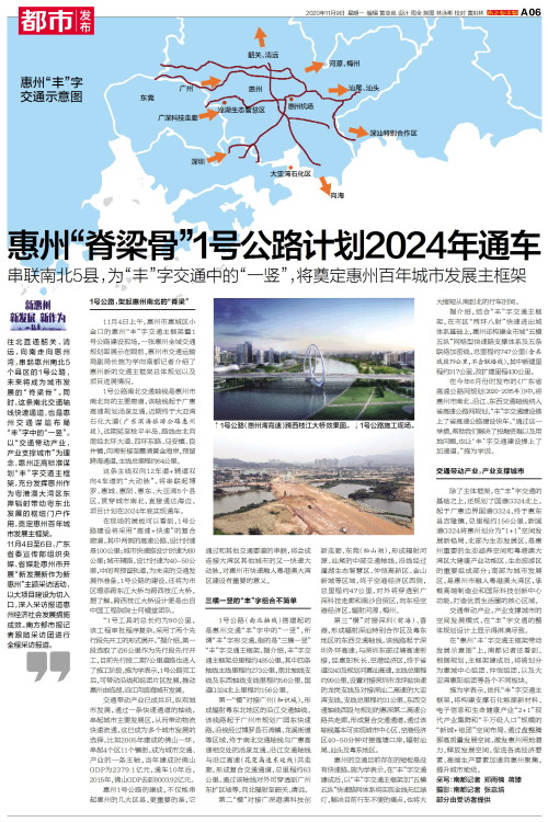 往北直通韶关、清远,向南走向惠州湾,串起惠州南北5个县区的1号公路,未来将成为城市发展的“脊梁骨”。同时,这条南北交通轴线快速通道,也是惠州交通谋篇布局“丰”字中的“一竖”。以“交通带动产业,产业支撑