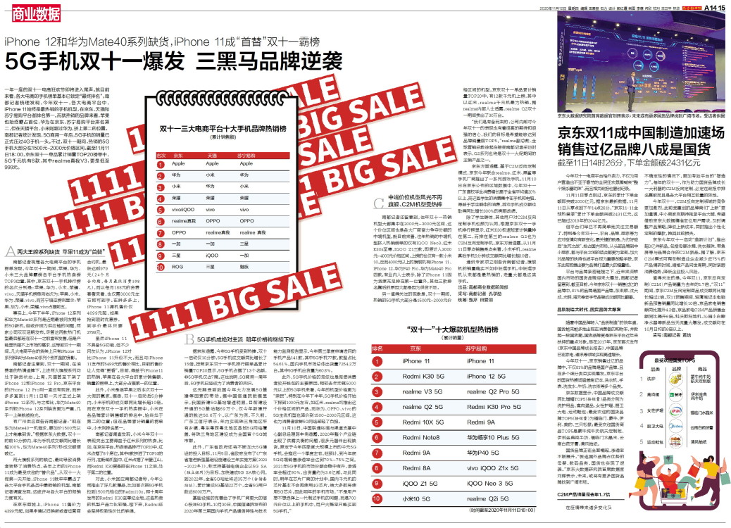 一年一度的双十一电商狂欢节即将进入尾声。就目前来看,各大电商的手机榜单基本已锁定“最终排名”。南都记者梳理发现,今年双十一,各大电商平台中,iPhone 11始终是最热销的手机机型,在京东、天猫和苏宁