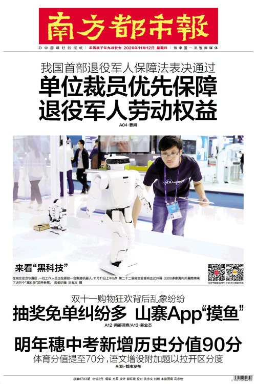 在高交会龙华展区,一位工作人员正在操控一台表演机器人。11月11日上午9点,第二十二届高交会宣布正式开幕,3300多家海内外展商带来了近万个“黑科技”项目参展。 南都记者 刘有志 摄