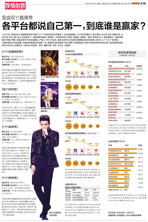 11月10日,在四台双11直播秀的轮番“轰炸”之下,热闹的买买买节落幕了。四台直播晚会,200多位明星艺人参与表演,在江苏卫视、湖南卫视、北京卫视、东方卫视、浙江卫视演绎了一场喧闹的拼盘式“演唱会”,
