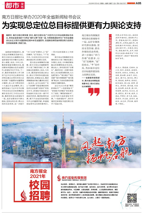 南都讯 南方日报记者陈理 昨日,南方日报社在广州召开2020年全省新闻秘书会议。来自全省各地的110多名“编外记者”欢聚一堂,为党报集团如何为广东在全面建设社会主义现代化国家新征程中走在全国前列、创造