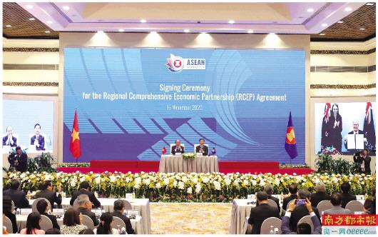 昨日,越南首都河内,区域全面经济伙伴关系协定(RCEP)签署仪式现场。15个RCEP成员国——东盟10国和澳大利亚、中国、日本、韩国、新西兰正式签署该协定,这意味着全球最大自贸区正式诞生。RCEP由东盟于2012年发起,历经8年谈判,这个覆盖世界人口最多、经贸规模最大、最具发展潜力的自贸区终于正式启航。这是东亚区域经济一体化新的里程碑,将有力提振区域贸易投资信心。 新华社/越通社发