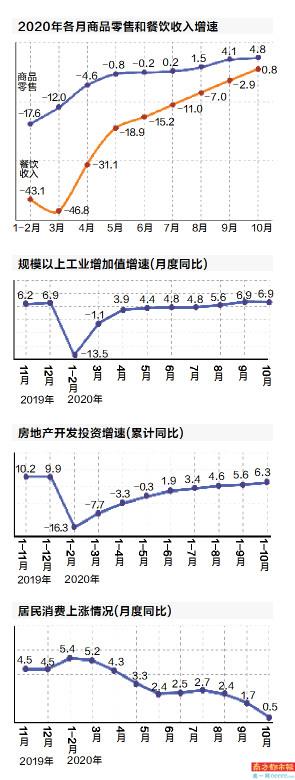 从消费来看,随着生产生活秩序的恢复,消费的前景也在增强。10月就业形势继续改善,城镇调查失业率为5.3%,比上个月下降。就业的改善有利于居民收入的增长,前三季度全国居民可支配收入扣除价格因素同比增长0.6%,也在回升。这样有利于消费能力的持续提高。同时,国内疫情防控取得了重大的阶段性成果,国内的消费环境改善,公众的消费信心增强。“十一”期间,无论是国内的游客数量还是旅游收入,都是在明显改善和提升,票房收入也恢复到上年同期的七成以上。