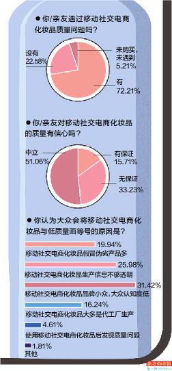 的确,仅有少数人对移动社交电商化妆品的质量有信心,民调结果显示,仅有15.71%的受访者认为移动社交电商化妆品的质量有保证,有高达33.23%的受访者认为移动社交电商化妆品的质量无保证,剩下的51.06%的受访者态度中立,认为移动社交电商化妆品的质量还行。