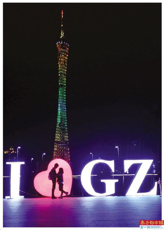 2014年灯光节,一对情侣在花城广场我爱广州灯光雕塑前留影。