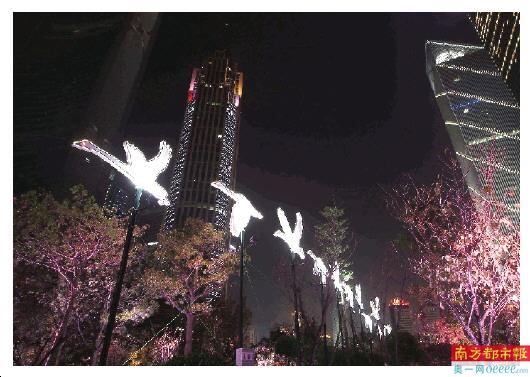 2013年灯光节,一排“天鹅”从高楼大厦间轻盈飞过。