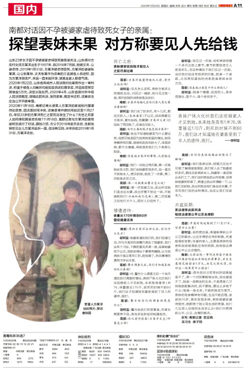 表妹尸体火化时我们这些娘家人才见到她,本来她身高有1米76,体重接近170斤,到死的时候不到60斤,我们这才知道她在婆家受到了非人的虐待、殴打。 ——谢树雷山东23岁女子因不孕被婆家虐待致死案备受