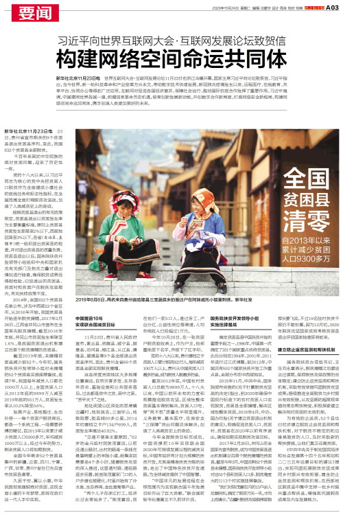 新华社北京11月23日电 23日,贵州省宣布剩余的9个贫困县退出贫困县序列。至此,我国832个贫困县全部脱贫。千百年来困扰中华民族的绝对贫困问题,迎来了历史性一刻。党的十八大以来,以习近平同志为核心的