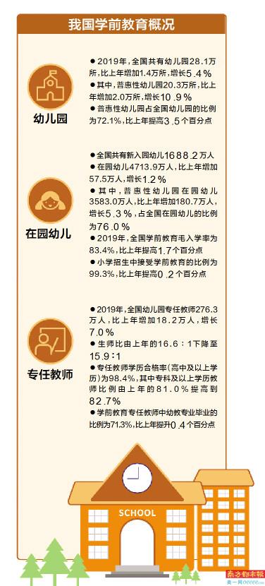 教育部数据显示,截至2019年,全国共有幼儿园28.1万所,在园幼儿4713.9万人,比上年增加57.5万人。学前三年毛入园率达到83.4%,普惠性幼儿园覆盖率达到76.01%,公办园在园幼儿占比达到43.79%。