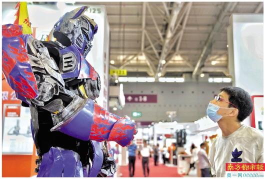2020中国工业互联网大会昨日在深圳开幕,大会展区内,采购商正在参观机械制造设备机器人展品。当天,广东省产业集群数字化转型试点启动仪式举行,全省共9个产业集群参与试点。据悉,广东省已累计推动1.5万家工业企业运用工业互联网实施数字化转型。 石磊 摄