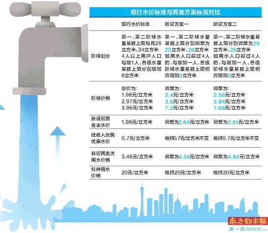 据此,广州市发改委提出上调自来水价,两套价格调整听证方案阶梯范围均较现行标准缩小:用水人口数4人或以下的居民家庭用水户第一、第二阶梯水量基数上限分别调整为20立方米、26立方米,如用水人口超过4人的,每增加一人,各级阶梯水量基数上限相应增加5立方米。方案一居民用水三个阶梯水价标准分别为2.4元/立方米、3.6元/立方米、7.2元/立方米;方案二居民用水三个阶梯水价标准分别为2.56元/立方米、3.84元/立方米、7.68元/立方米。