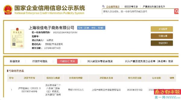 国家企业信用信息公示系统显示上海妆佳电子商务有限公司受处罚。