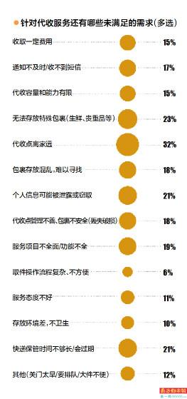 数据显示,“代收点离家远”成为用户反馈比例最高的问题,占32%;反映“保管时间不够长”“个人快递信息可能被窃取”“无法保存特殊包裹(生鲜/贵重品)”“服务项目不全面,无法满足更多需求”“通知不及时”等问题,均占比20%左右。