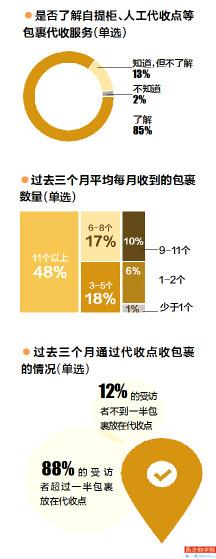 其中,过去三个月,高达88%的用户通过小区代收点收过包裹,因家里没人而需要使用代收服务的用户占到4成,同时3成用户希望快递代收点离家更近。