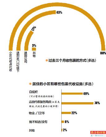 南都记者统计发现,过去三个月,有88%的受访用户使用小区代收点(如物业、代收小店、驿站、自提柜等)收过包裹;他们收取的所有包裹中,放在代收点的占比过半(含)。相比而言,有43%的用户在过去三个月包裹曾被送到小区家门/楼下,送到公司的则有17%。