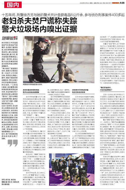 徐方芳的工作总是围绕空气中游走的气味展开。在无数个案发现场,徐方芳带领警犬搜寻着常人难以发现的隐秘证据。据介绍,警犬嗅觉的灵敏度是人类的一百万倍,这也让警犬往往在案发现场成为发现关键证据的最强助手。“