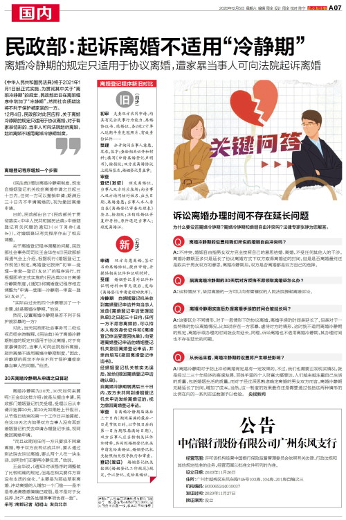 《中华人民共和国民法典》将于2021年1月1日起正式实施,为贯彻其中关于“离婚冷静期”的规定,民政部近日在离婚程序中增加了“冷静期”,然而社会质疑这将不利于保护被家暴的一方。12月4日,民政部对此回应