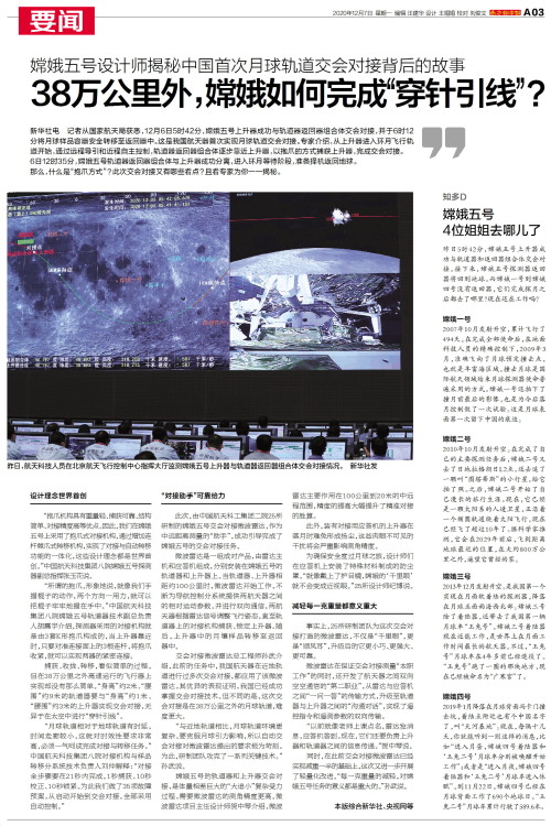 新华社电 记者从国家航天局获悉,12月6日5时42分,嫦娥五号上升器成功与轨道器返回器组合体交会对接,并于6时12分将月球样品容器安全转移至返回器中。这是我国航天器首次实现月球轨道交会对接。专家介绍,