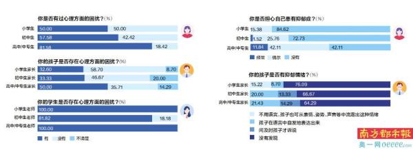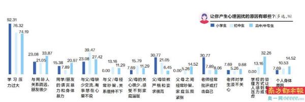 为了解儿童青少年的心理健康状况,南都民调中心近日对中小学生、家长和老师发起民意调查,调查结果显示:超六成受访中小学生认为自己有心理方面的困扰,主要表现包括情绪不稳、学习困难、缺乏自信、考试焦虑;小升初经历学习压力骤增及青春期生理发育双重转变,初中学生心理困扰激增;学习压力过大是受访中小学生产生心理困扰的首要原因,但亲子关系、同伴关系亦是不容忽视的重要原因;年级越高学生越关注抑郁症话题,过半受访高中/中专生表示担心自己患抑郁症。