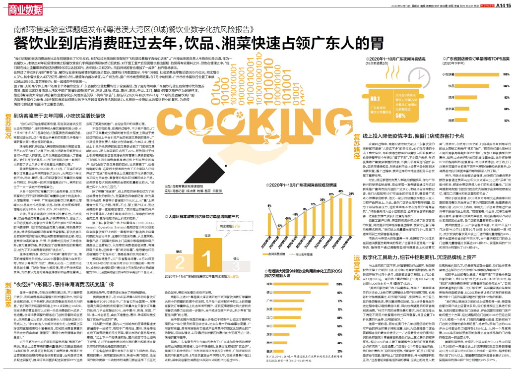 据了解,无论是个体工商户还是非个体餐饮企业,广东省餐饮企业数量均位于全国首位。为了更好地观察广东餐饮行业在后疫情时代的复苏情况,南都记者以粤港澳大湾区中的广东省9城市(即广州、深圳、珠海、佛山、惠州、东莞、中山、江门、肇庆)的餐饮商户作为调研样本,推出《粤港澳大湾区(9城)餐饮业数字化抗风险报告》(以下简称“报告”)。报告以2020年和2019年1月-11月的美团餐饮商户到店消费数据作为参考,浅析餐饮商家如何通过数字化手段提高自身抗风险能力,从而进一步带动本地餐饮行业的复苏,为后疫情时代的经济内循环作出重要贡献。