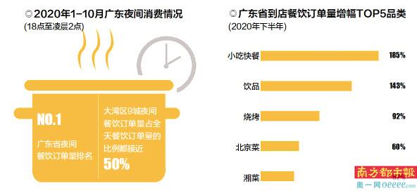 美团数据显示,2020年1月-11月,广东省的到店餐饮订单量比去年同期增长了25.9%。大湾区9个样本城市中,深圳、肇庆、佛山的到店餐饮订单量同比增幅分列前三,排名第一的深圳增幅高达67%,其同时也位于一众一线城市的增幅首位。