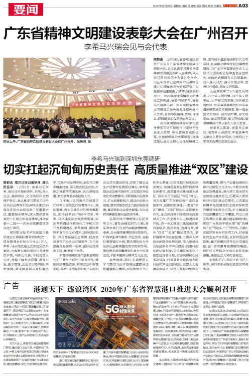 南都讯 12月9日,省委和省政府在广州召开广东省精神文明建设表彰大会。会议认真学习贯彻全国精神文明建设表彰大会精神,深入学习贯彻党的十九届五中全会、习近平总书记出席深圳经济特区建立40周年庆祝大会和视