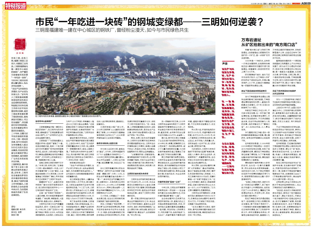 改革篇先有三钢,后有三明。福建三明因工业而兴,也曾因工业而扰。三钢是福建省内唯一建在中心城区的钢铁厂,但严重的污染曾被市民形容“一年吃进一块砖”,1995年三明市区的降尘量与鞍山、包头并列全国第一