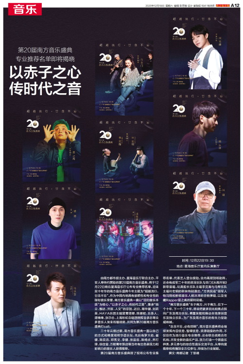 时间:12月22日19:30地点:星海音乐厅室内乐演奏厅由南方都市报主办、星海音乐厅联合主办、平安人寿特约赞助的第20届南方音乐盛典,将于12月22日晚在星海音乐厅公布专业推荐名单。迎来双十年华的南方