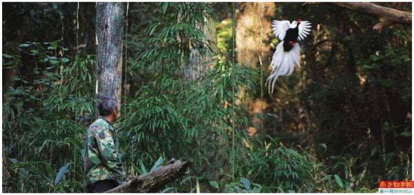 杨美林初次与白鹇结缘是2012年,冬季山林里食物匮乏,白鹇常常与他养的鸡争夺饲料。杨美林见了也不驱赶,久而久之老人与鸟便熟悉了起来。