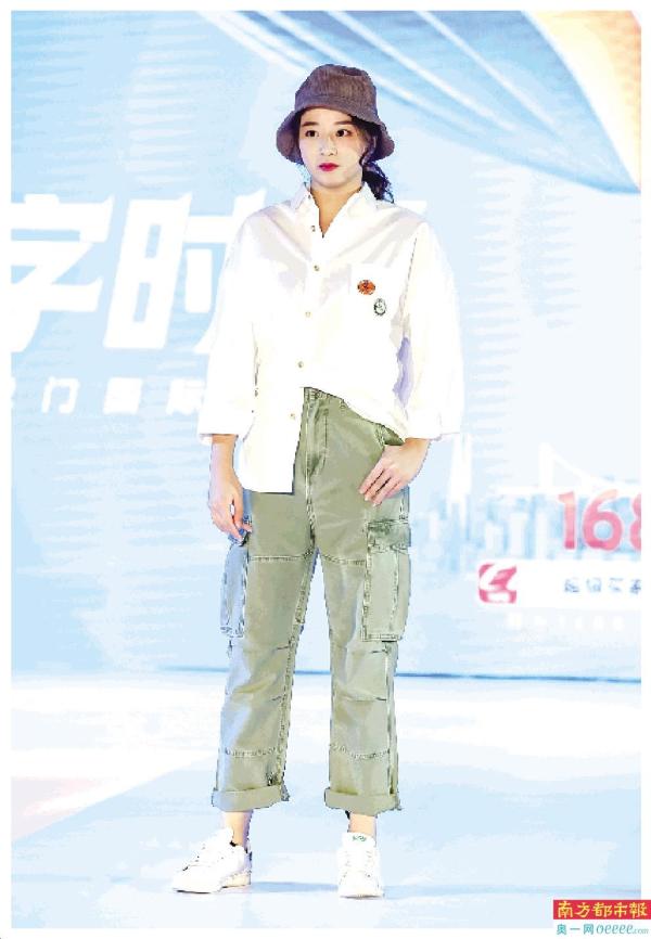 今年12月9日,第七届虎门国际电商节商家路演的T台上,女模特在展示荟天服饰的男装。