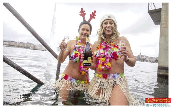 冬泳 2. 1月1日,在瑞士日内瓦的日内瓦湖,两名女子手握香槟酒参加冬泳迎新年活动。