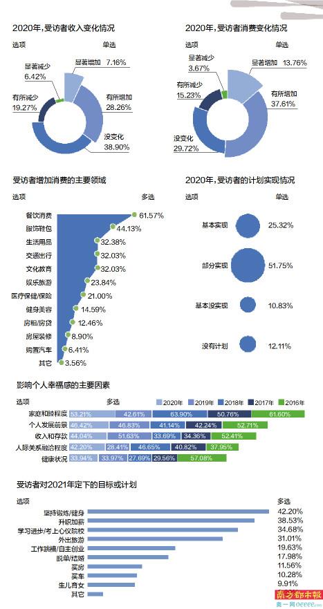 南都民调中心连续第五年发起公众生活感知度调查,于2020年12月下旬组织实施的调查结果显示:受访者中约六成半表示更珍惜和家人在一起的时光,各有近两成表示这一年成功升职、加薪或跳槽,近六成表示在过去的一年里感到幸福,超七成对2021年充满信心。