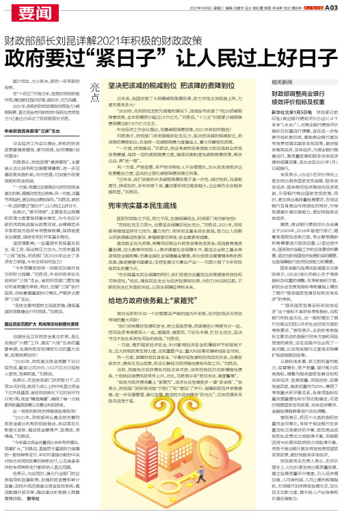 国计民生,大小账本,新的一年有新的安排。在“十四五”开局之年,发挥好财政职能作用,推动新征程开好局、起好步,尤为关键。2021年,积极的财政政策如何再发力?减税降费、直达资金有何新安排?保民生怎样发力