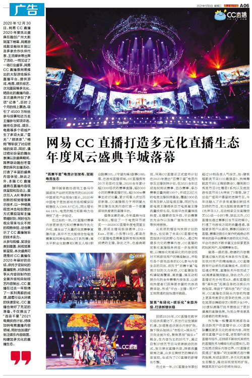 2020年12月30日,网易CC直播2020年度风云盛典在融创广州大剧院落下帷幕,网易游戏副总裁张丰翼以及多家合作伙伴代表、主流媒体等出席了活动,一同见证了一场行业盛事。网易CC直播是网易推出的大型游
