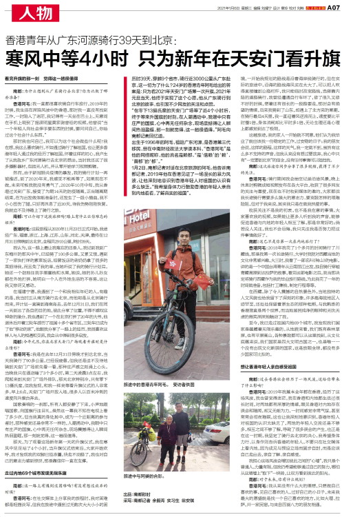 历时39天,穿越9个省市,骑行近3000公里从广东赴京,这一切为了什么?24岁的香港青年阿毛给出的答案是:只为看2021年天安门广场第一次升旗。2021年元旦当天,他终于实现了这个心愿。他从广东骑行到