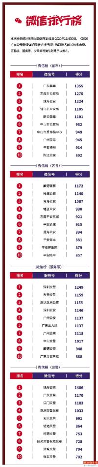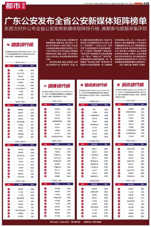 为进一步推动全省公安新媒体持续健康发展,鼓励先进,树立导向,广东省公安厅新闻中心组织开展了对全省公安政务新媒体的绩效评估考核,并于1月6日发布《2020年全省公安新媒体矩阵排行榜》。据悉,这是广东公安