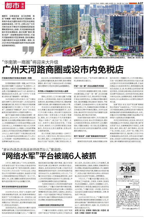 南都讯 记者夏嘉雯 实习生韩畅 有着“华南第一商圈”美誉的天河路商圈,未来将升级成为国际消费示范区和名牌名品销售集聚区。1月7日,记者从在广州天河举办的关于推动天河路商圈高质量发展新闻发布会上获悉,天