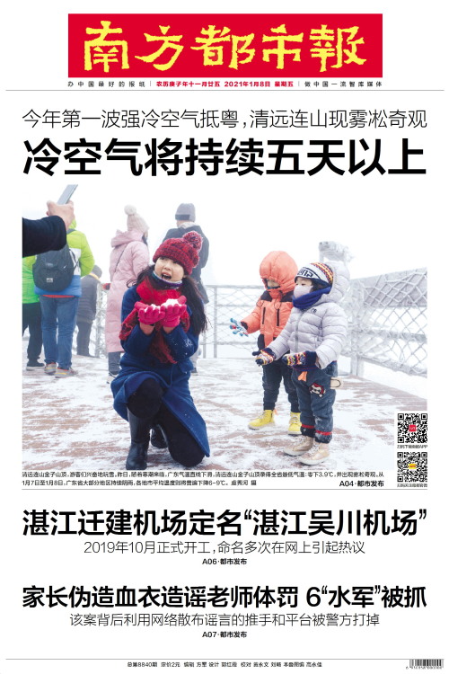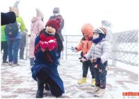 清远连山金子山顶,游客们兴奋地玩雪。昨日,随着寒潮来临,广东气温直线下滑,清远连山金子山顶录得全省最低气温:零下3.9℃,并出现雾凇奇观。从1月7日至1月8日,广东省大部分地区持续阴雨,各地市平均温度