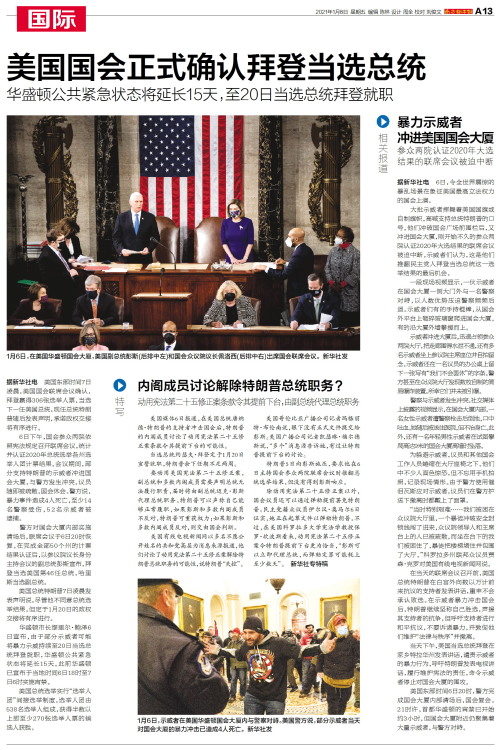 据新华社电 美国东部时间7日凌晨,美国国会联席会议确认,拜登赢得306张选举人票,当选下一任美国总统。现任总统特朗普随后发表声明,承诺政权交接将有序进行。6日下午,国会参众两院依照宪法规定召开联席会议