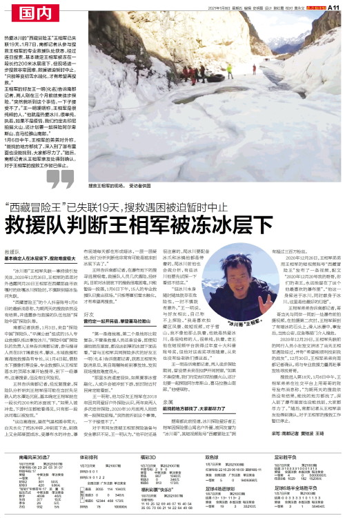 热爱冰川的“西藏冒险王”王相军已失联19天。1月7日,南都记者从参与搜救王相军的专业救援队处获悉,经过连日搜索,基本确定王相军被冻在一段长约200米冰层底下,但现场进一步搜救非常困难,救援被迫暂时中止