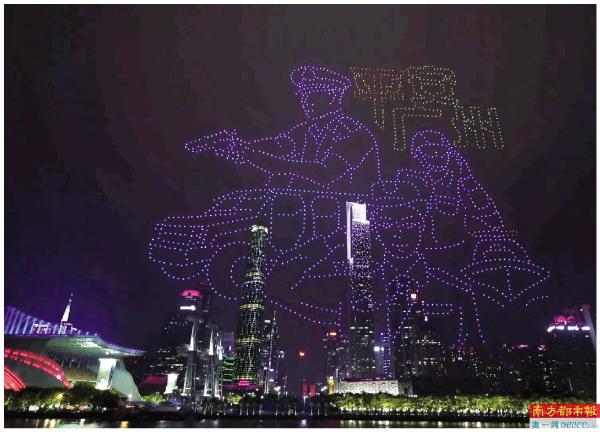 昨晚,广州市公安局举办庆祝首个中国人民警察节暨广州110成立35周年铁军形象展示活动。当晚,3000余架无人机表演配合铁军展示,祝福警察节的绚丽图案为羊城夜空增色添彩。 南都记者 徐杰 实习生 朱敏谊 摄