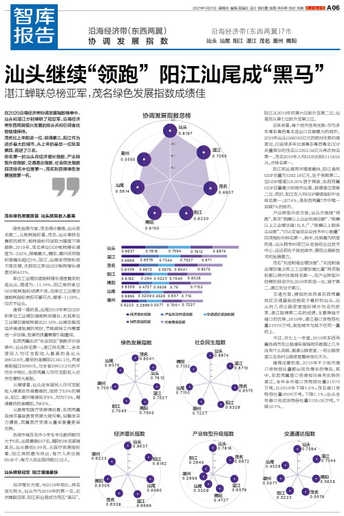 沿海经济带(东西两翼)协调发展指数沿海经济带(东西两翼)7市汕头 汕尾 阳江 湛江 茂名 潮州 揭阳在2020沿海经济带协调发展指数榜单中,汕头和湛江分别蝉联了冠亚军,沿海经济带东西两翼振兴发展的排头